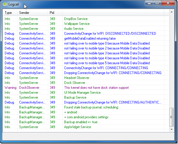 A program Logcat funkciót is tartalmaz, mely debuggolásnál jöhet kapóra. A megjelenítést szép, színes felülettel végzi, hasonlóan elválasztva a különböző tagokat, mint a Notepad++.